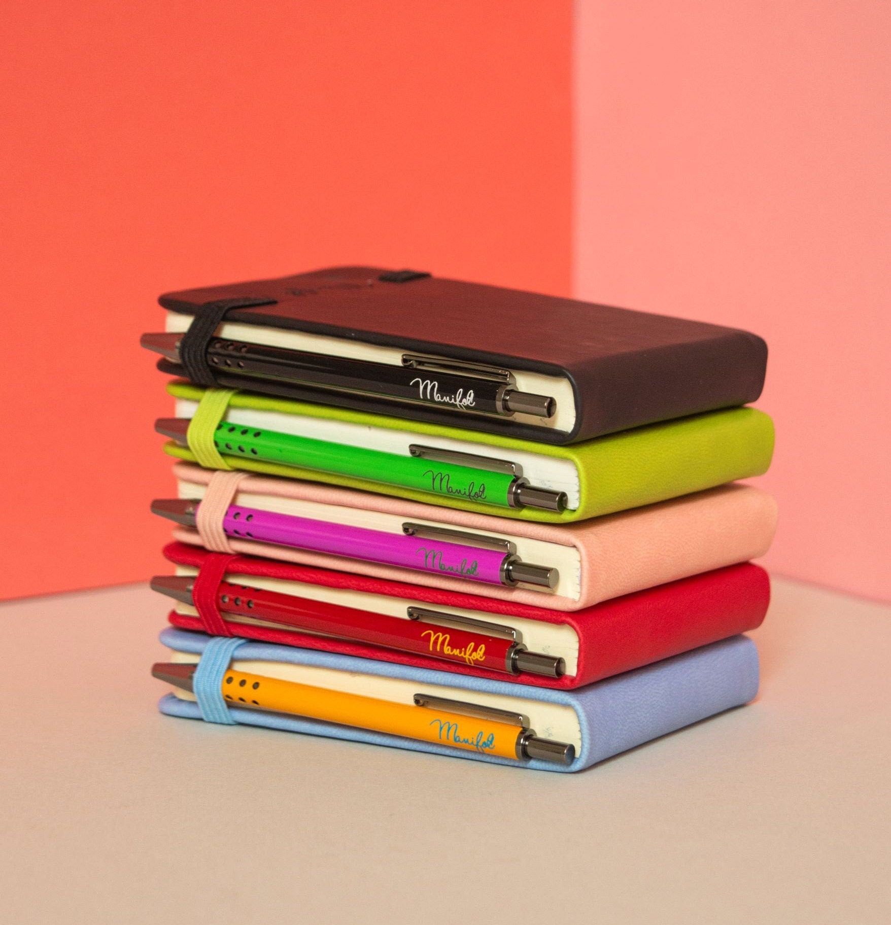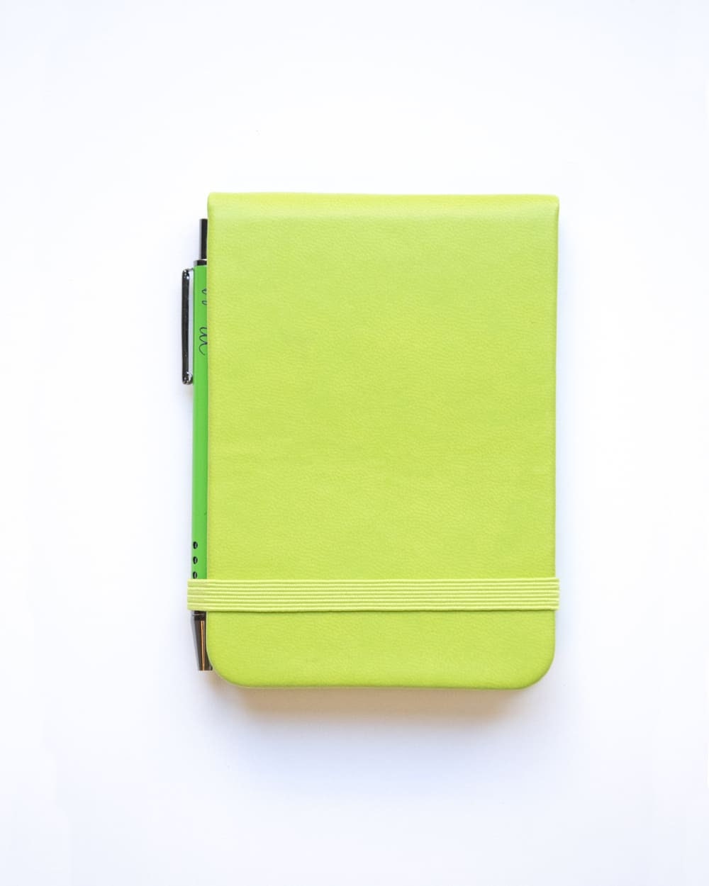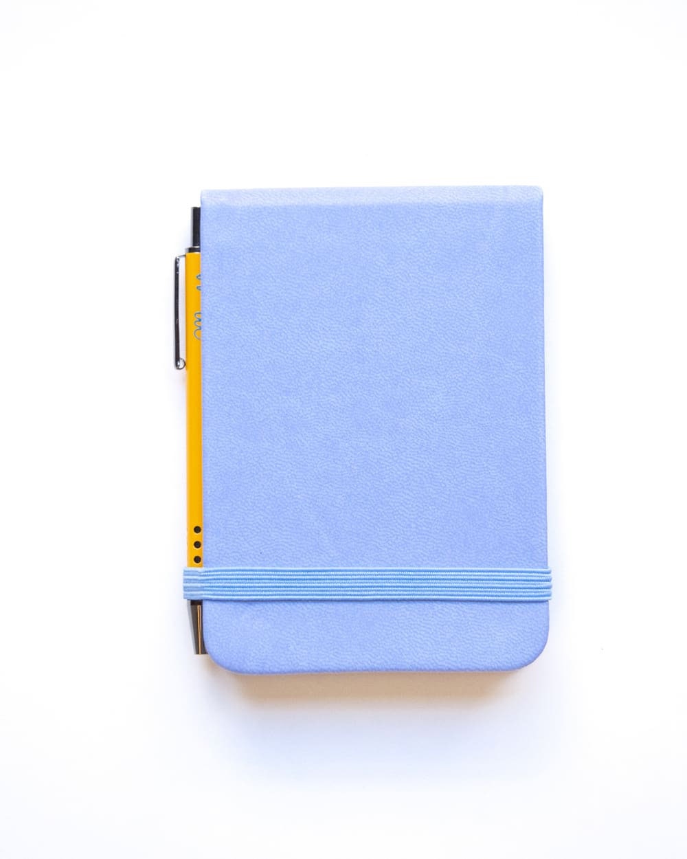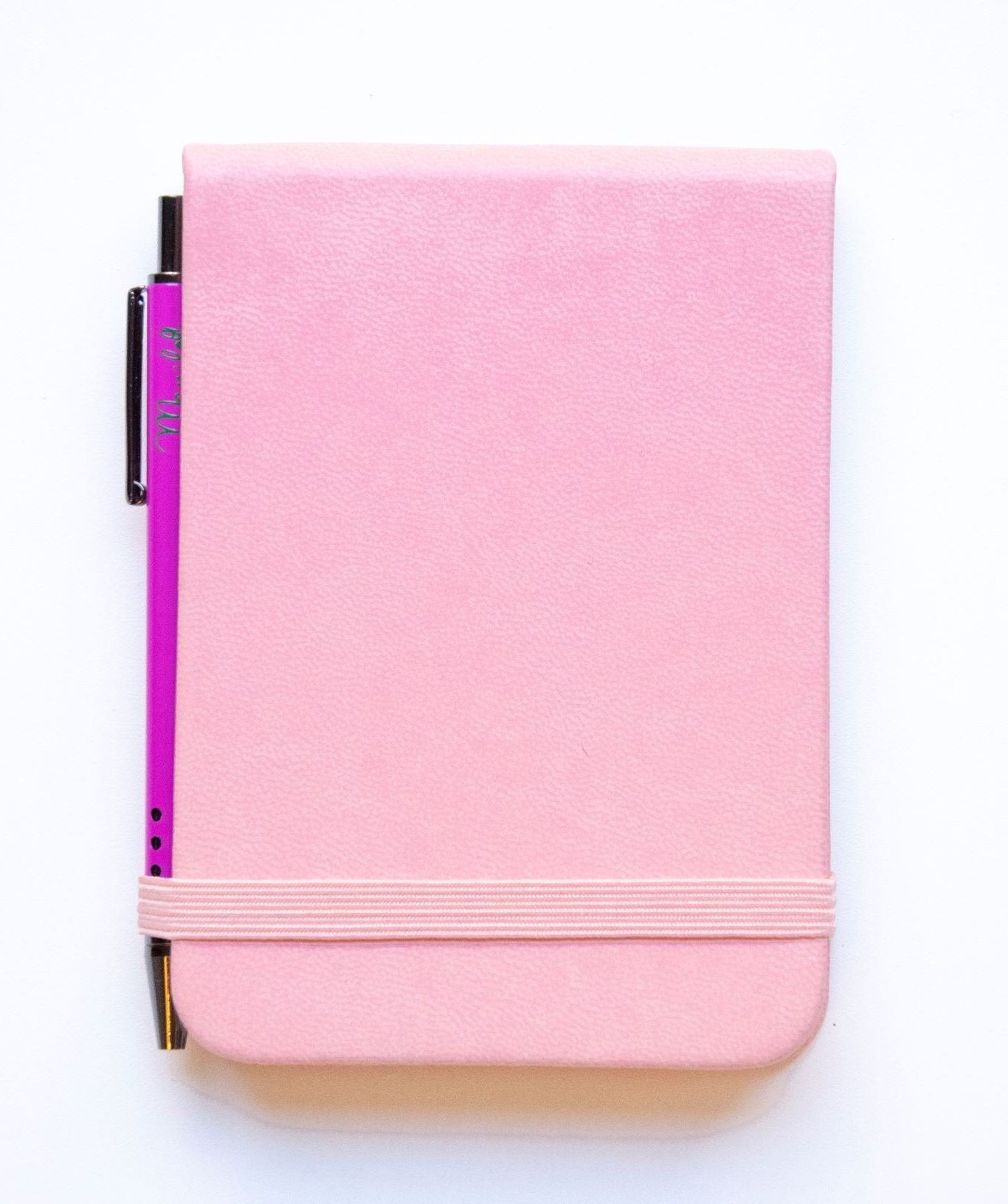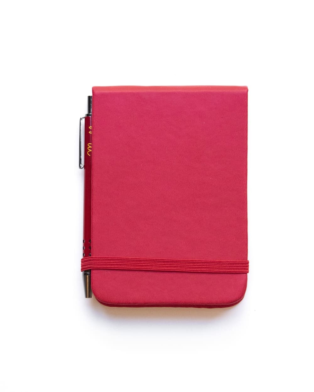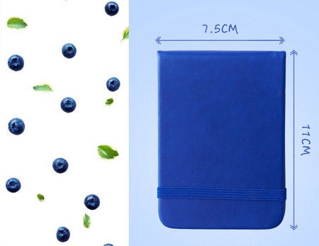 “Pocket vertical notebook (11×7.5 cm) with a matching metallic ball pen. Features a soft cover with an elastic band. Contains 96 sheets, half lined and half plain.”
