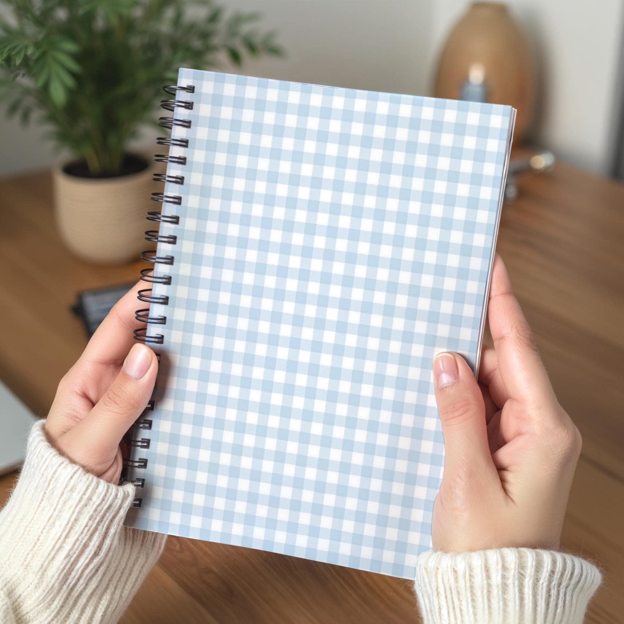 This powder blue gingham journal/notebook offers a preppy aesthetic, ideal for school, office, or personal writing. Available in hardback or spiral, it’s a thoughtful gift or desk addition.